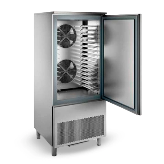 Material: Acero inoxidable Enfriamiento por aire Capacidad: 5 bandejas1/1 (cm 53×32,5) o N. 5 cm 60×40 Rendimiento de refrigeración: +70°+3° Congelación rápida: +70° -18° (Kg 15) Medidas cm L 75 x P 70x h 85 – CE